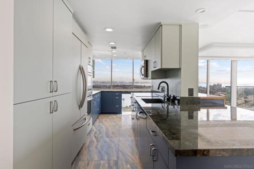 Discover the pinnacle of coastal sophistication from the 15th floor of the prestigious Coronado Shores El Mirador Tower. This exquisite 2-bedroom plus den, 2.5-bath residence showcases sweeping views of the Pacific Ocean and Glorietta Bay — a breathtaking canvas for everyday living. Meticulously reimagined, the interior features floor-to-ceiling glass walls, rare Labradorite stone countertops, and polished Italian porcelain tile flooring that radiates timeless elegance. The seamless open layout offers both refinement and relaxation, designed for effortless modern living. Residents enjoy a truly lock-and-leave lifestyle enhanced by 24-hour security, direct beach access, ocean-view pools, tennis and pickleball courts, and a fully equipped fitness center. Ideally located just steps from the legendary Hotel del Coronado, fine dining, and boutique shopping, this turnkey retreat embodies luxury, convenience, and coastal serenity. Schedule your private tour today and experience elevated oceanfront living at its finest.