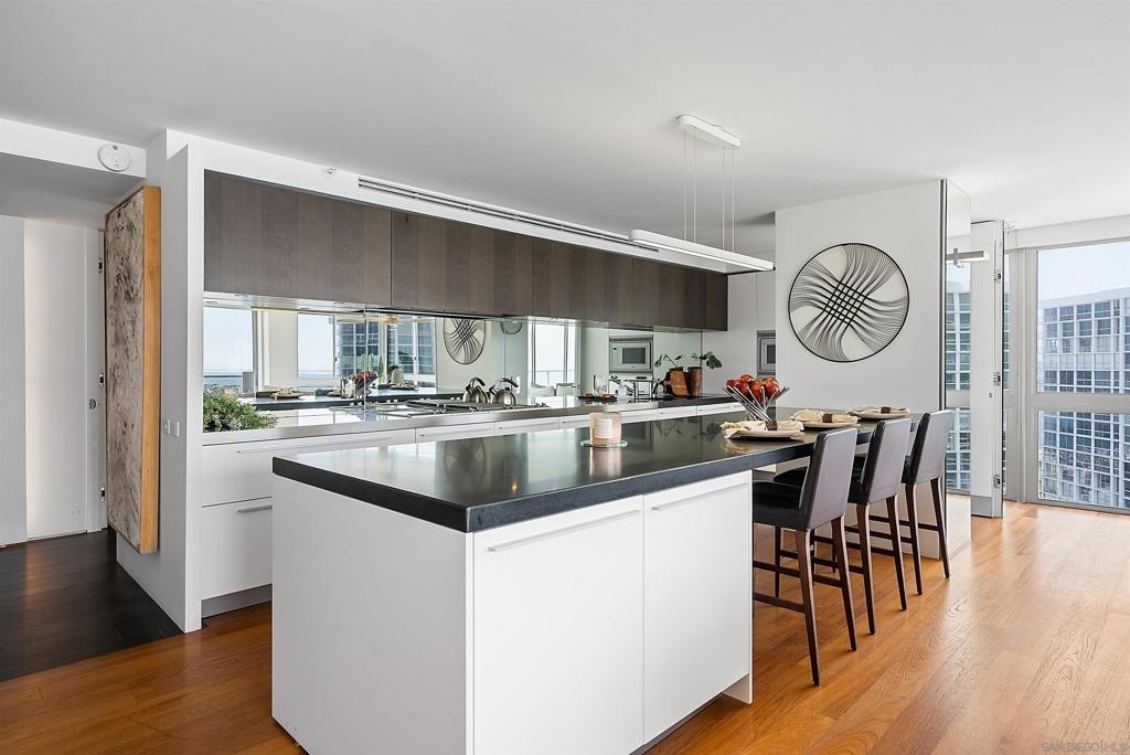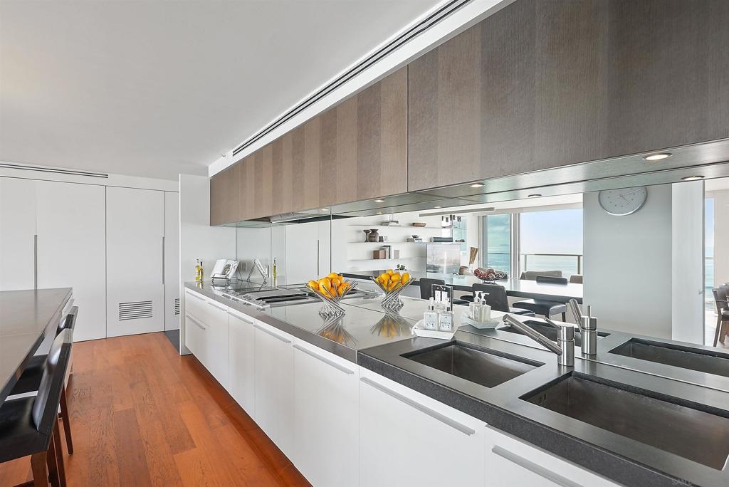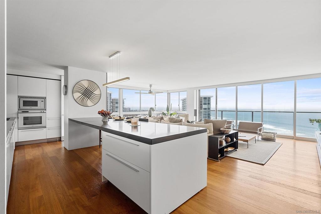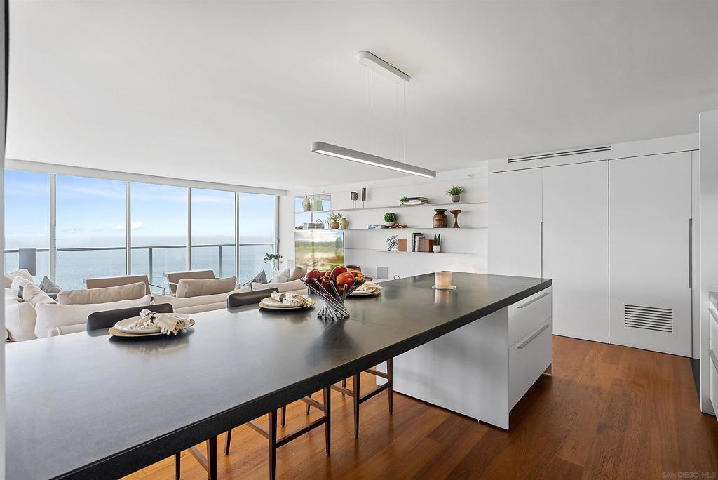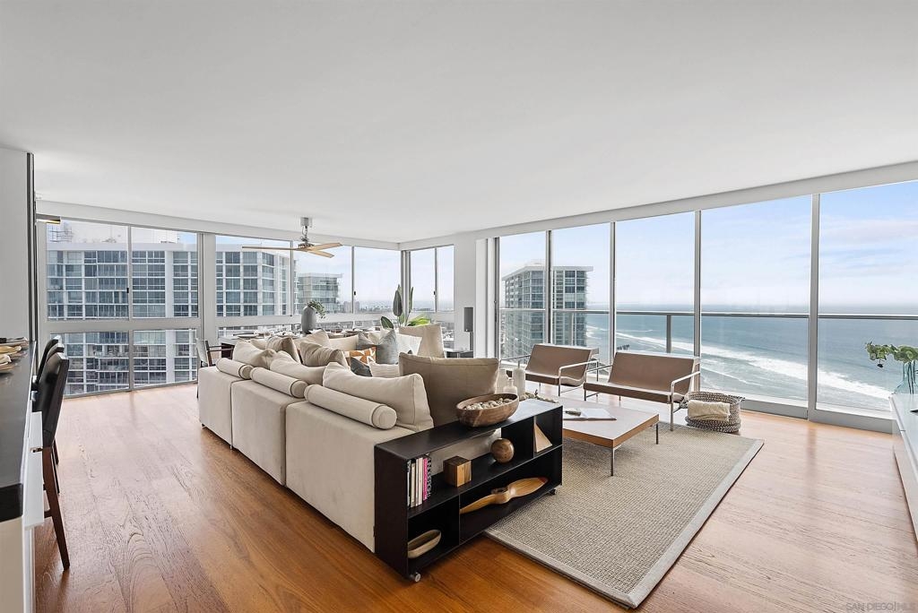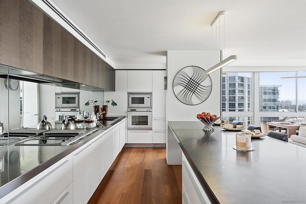 Price Improvement! Luxury living atop La Perla Tower with breathtaking views of the Pacific Ocean, Coronado Bridge, Bay, and Mountains. This premier corner unit, designed by architect Mauricio Gomez de Tuddo, offers a unique layout with a spacious master bedroom, 3 ensuite bathrooms, guest bathroom, and large laundry room. The exquisite interior features a blend of granite and hardwood flooring, a European-inspired kitchen with Boffi cabinets and top-of-the-line Gaggenau appliances. Floor-to-ceiling doors and double-paned windows create a bright and open atmosphere. Italian furniture enhances the upscale design, and two parking spaces are included. Enjoy community amenities like tennis and pickleball courts, oceanfront pools, a spa, fitness center, Beach Club, and 24/7 security.