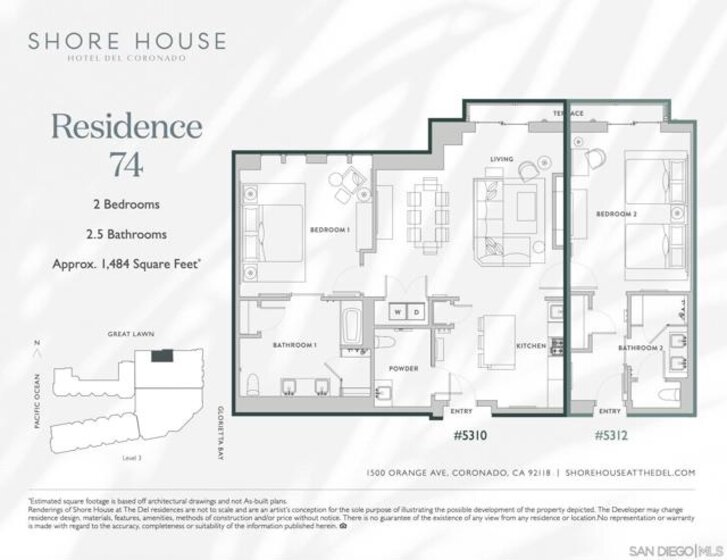 Owning a residence at Shore House is a once-in-a-lifetime opportunity to secure a piece of paradise along the Coronado coastline while gaining access to the Hotel del Coronado’s world-renowned hospitality. Residence 74 is one of only three “hospitality” layouts in the entire collection, offering an expansive 1,484 SQFT, 2BR/2.5BA sanctuary. The interior is a study in effortless coastal sophistication. At the heart of the residence is a spacious great room anchored by a fireplace & a signature L-shaped sectional, perfect for family gatherings The chef-inspired kitchen features a large center island, beverage center & a formal 8-person dining table, a rare configuration designed for entertaining .Glass doors open to a private Juliet balcony, framing panoramic, unobstructed views of the iconic Red Turret & the legendary front façade of The Del. As a Shore House owner, enjoy a "resort-within-a-resort" experience with exclusive amenities: a zero-edge infinity pool, Jacuzzi, cabanas, an open-air bar, & beachfront fire pits. Owners benefit from a dedicated arrival, private check-in & complimentary valet, along with full access to The Del’s world-class spa, fitness center & premier beach service on Coronado’s famous white sands. This full-ownership, limited-use property blends a legacy second home with a professionally managed rental program for seamless, hands-free income. The ultimate investment in lifestyle & legacy. The primary suite offers a true retreat, featuring a luxurious bathroom with a walk-in shower & double vanity sinks. With the inclusion of a queen-size pullout, an in-unit washer/dryer, the home comfortably sleeps eight. This residence also boasts intelligent "Two-Key" functionality, providing owners with maximum rental flexibility & utility