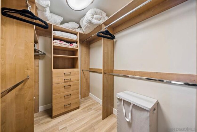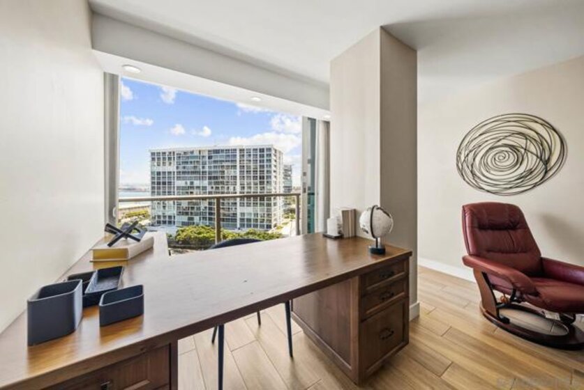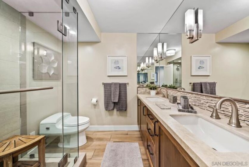 Experience luxury coastal living in one of the largest two-bedroom floor plan at The Shores. This beautifully remodeled unit designed by Michael Roy features new windows, automatic blinds, sleek ceramic tile flooring, a stunning "Taj Mahal" quartzite countertop and all high-end appliances. Thoughtfully designed with custom walk-in closets and premium finishes throughout. The unit is being offered furnished, making your move a breeze. A rare opportunity to own in La Perla tower, one of Coronado Shores most desirable buildings.
